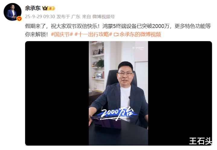 余承东在一段福视频中宣布了鸿蒙5终端设备突破2000万的消息,他表示:从0到1000万,我们用了将近10个月的时间。而1000万到2000万,我们只用了短短的2个月。